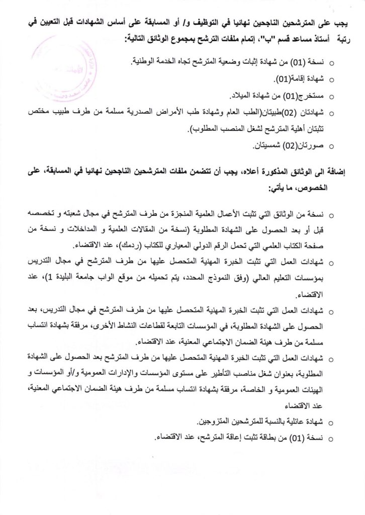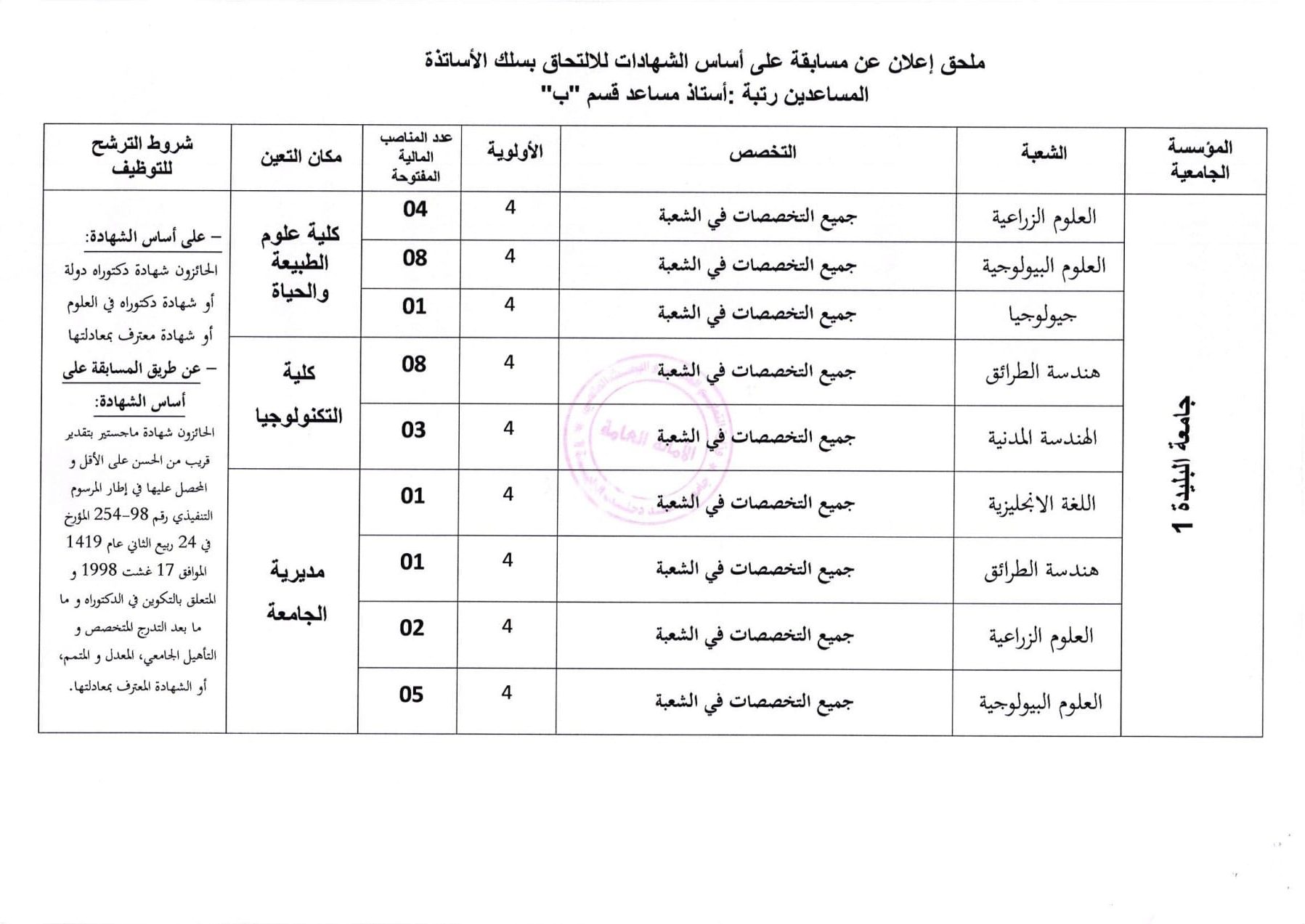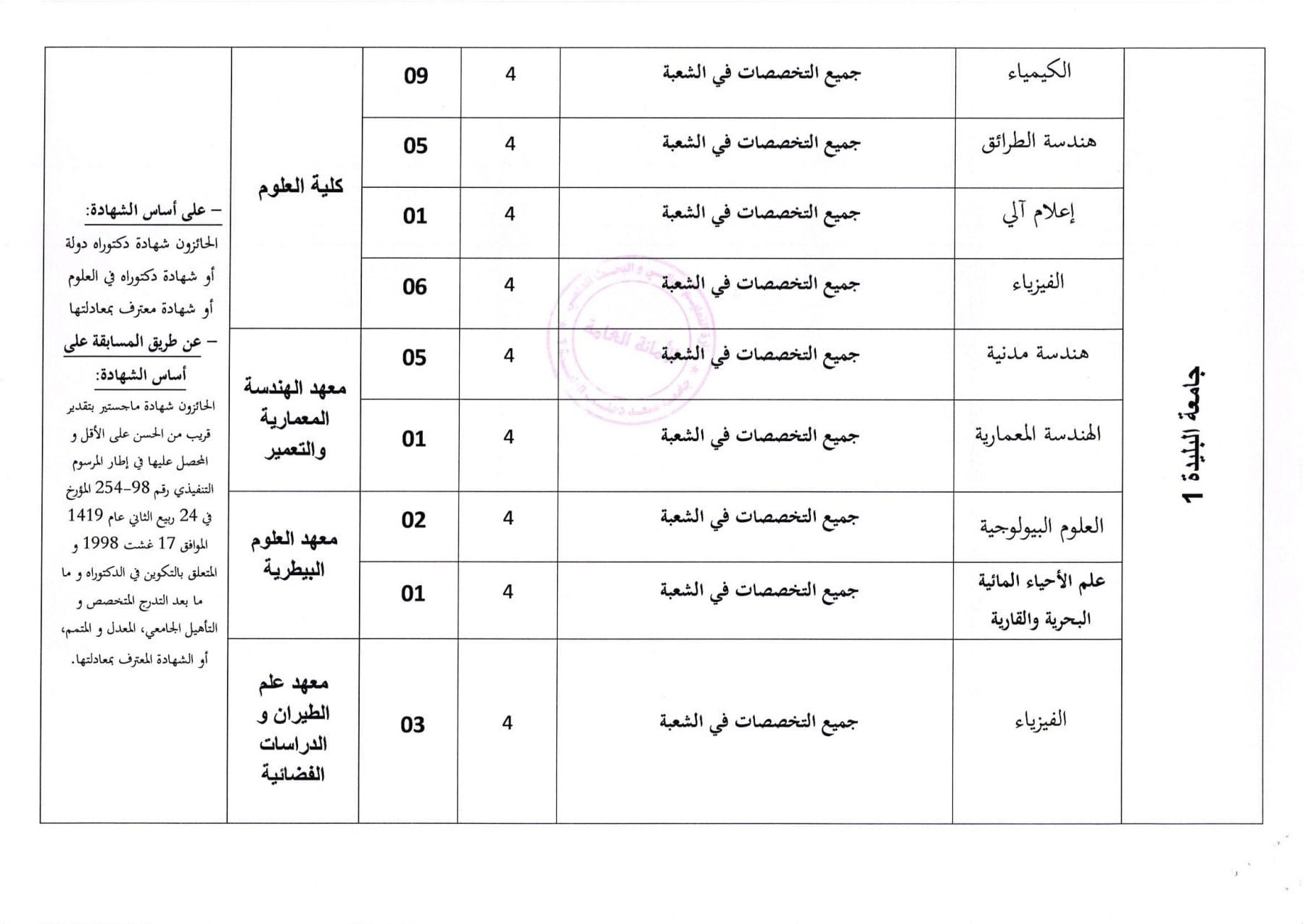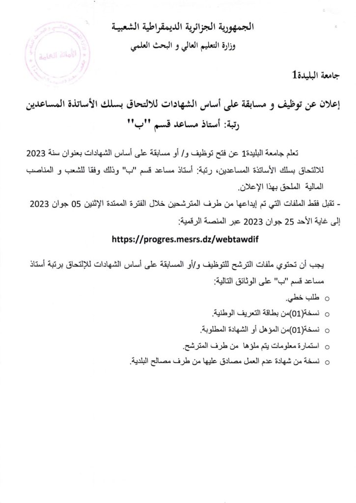 يشرح جامعة البليدة 1 سعد دحلاب حول التوظيف بناء على شهادة الالتحاق بسلك الأساتذة المساعدين برتبة: