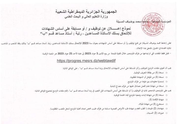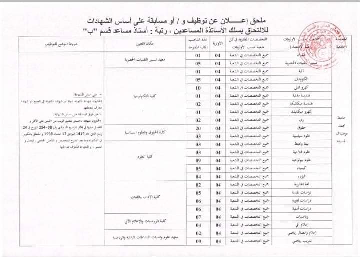 تعلن جامعة محمد بوضياف مسيلة عن التعيين بناءً على الشهادة للالتحاق بسلك الأساتذة المساعدين بالرتبة: