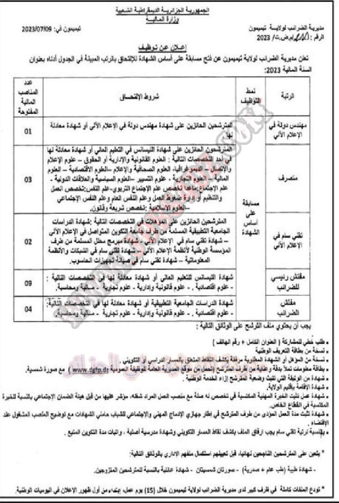 تعلن مديرية الضرائب في تيميمون عن فتح مسابقة توظيف بناء على الشهادة الموجودة في الصفوف المبينة أدناه