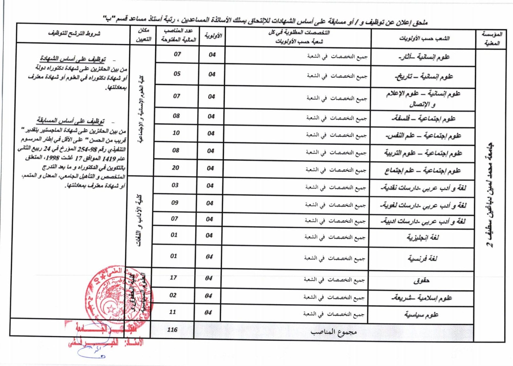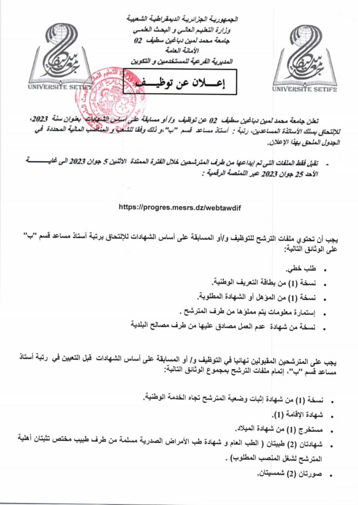 تعلن جامعة محمد لمين دباغين سطيف 02 عن التعيين بناءً على الشهادة للالتحاق بسلك الأساتذة المساعدين برتبة: