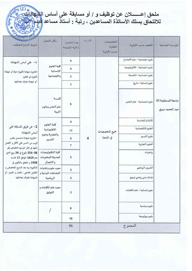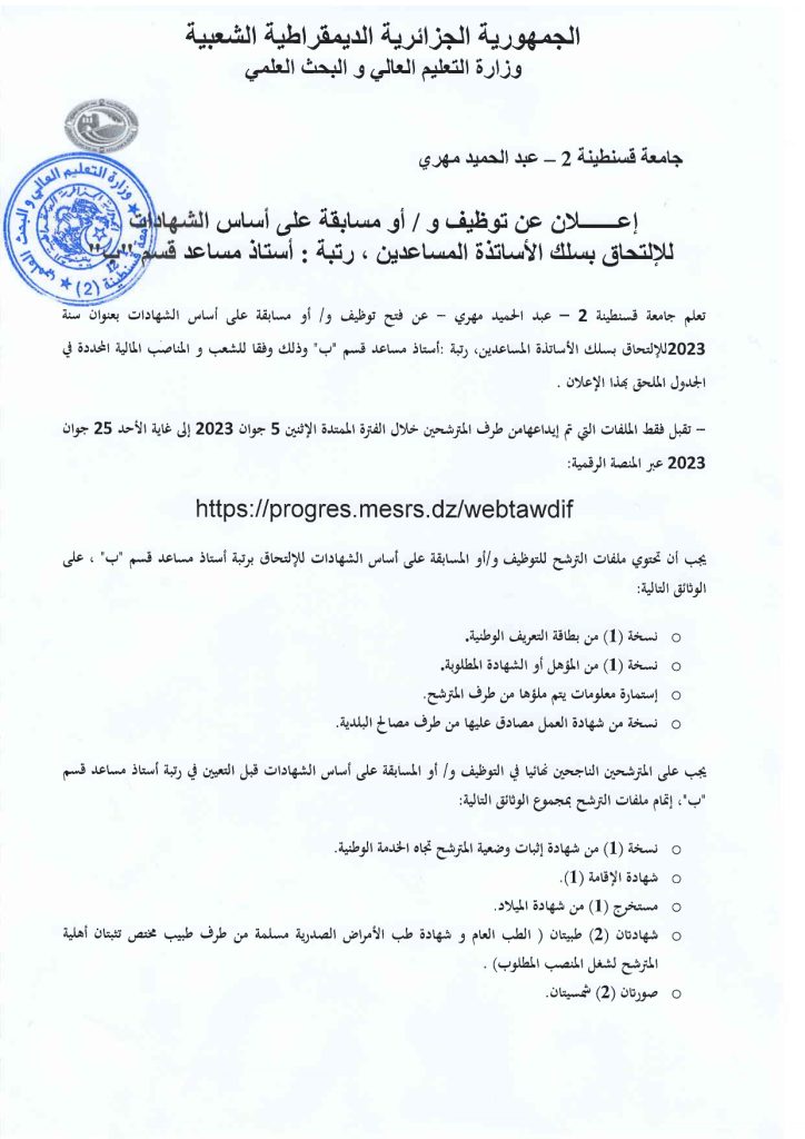 تعلن جامعة الجزائر 1 يوسف بن خدة عن الاستقدام بناء على الشهادة للالتحاق بسلك الأساتذة المساعدين بالرتبة: