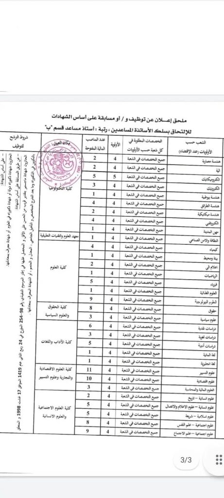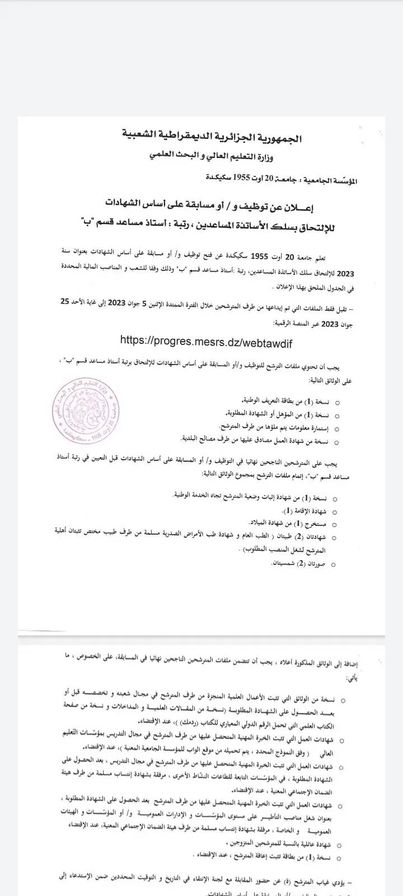 تعلن جامعة 20 أغسطس 1955 بسكيكدة عن التعيين بناءً على شهادة الالتحاق بسلك الأساتذة المساعدين برتبة: