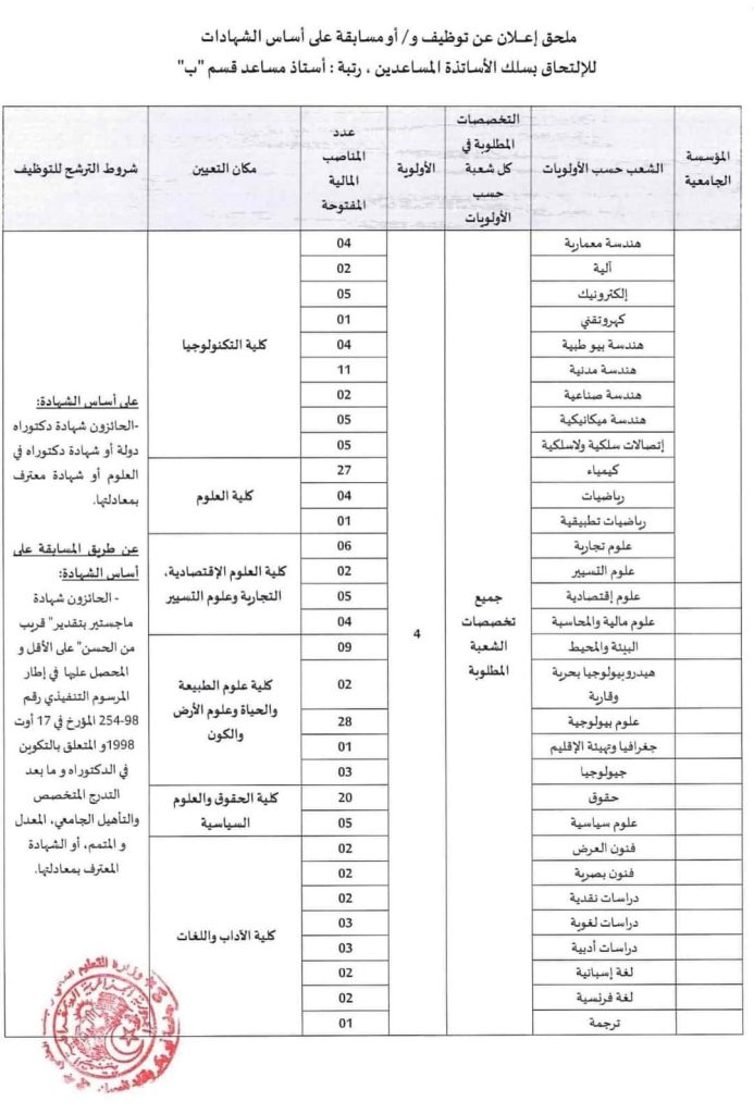 تعلن جامعة أبي بكر بلقابد تلمسان عن استقدامها بموجب شهادة للالتحاق بسلك الأساتذة المساعدين برتبة: