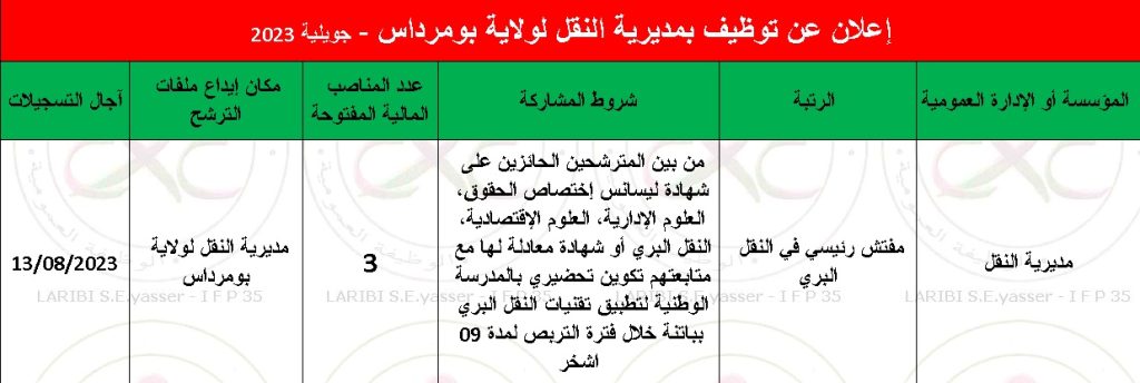 تعلن مديرية نقل ولاية بومرداس عن فتح مسابقة توظيف بناء على الشهادة في الصفوف الموضحة أدناه