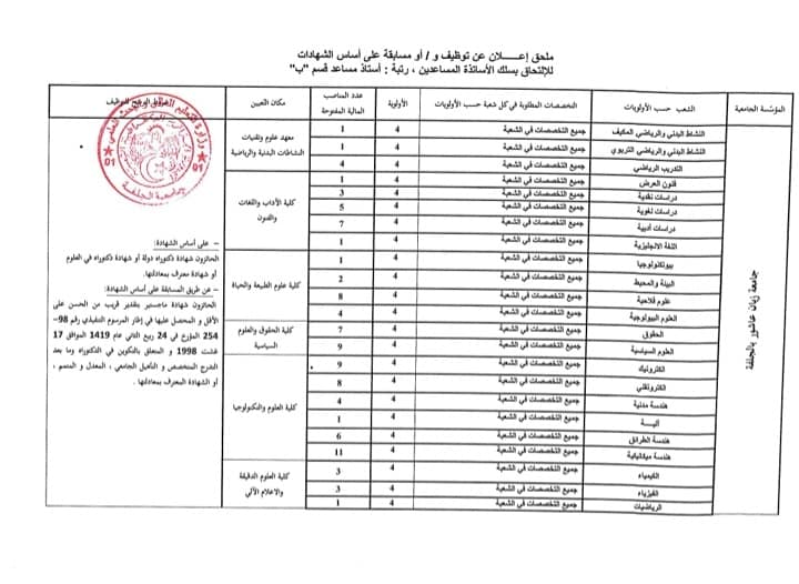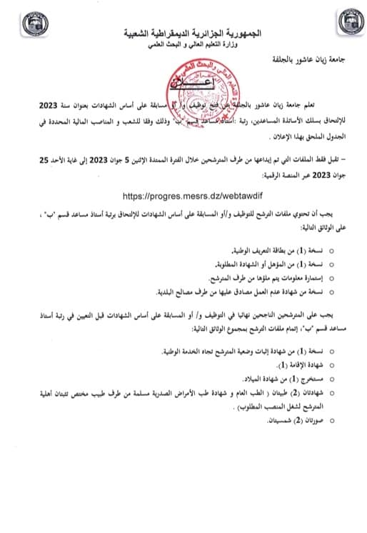 تعلن جامعة زيان عاشور بالجلفة عن توظيف بناءً على الشهادة للالتحاق بسلك الأساتذة المساعدين برتبة: