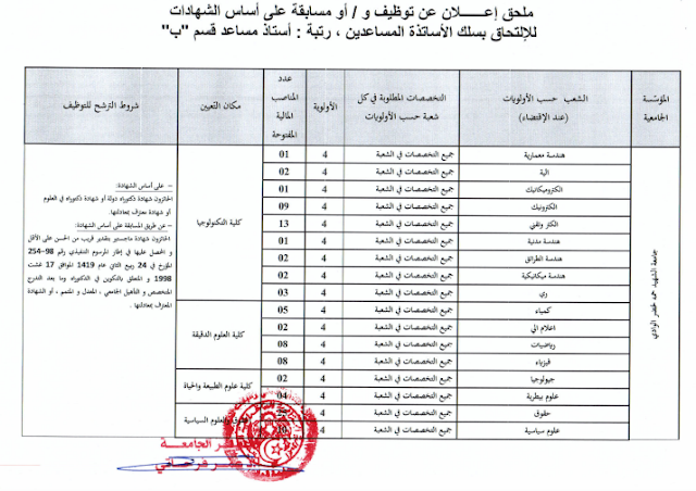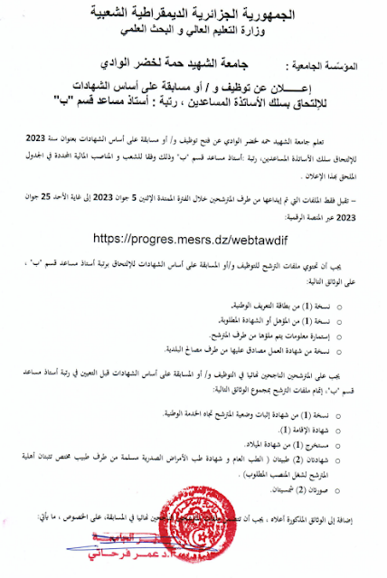 تعلن جامعة الشهيد حمه الأخضر بالوادي عن تعيينها بناءً على الشهادة للالتحاق بسلك الأساتذة المساعدين برتبة: