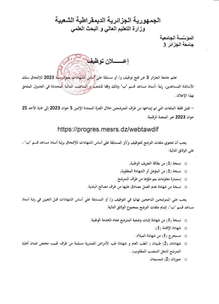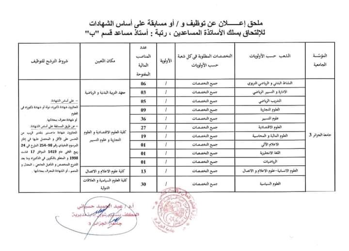 تعلن جامعة الجزائر 3 إبراهيم سلطان شيبوت عن التوظيف بناءً على الشهادة للالتحاق بسلك الأساتذة المساعدين بالرتبة:
