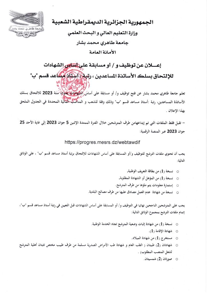 تعلن جامعة طاهري محمد بشار عن التوظيف بناءً على الشهادة للالتحاق بسلك الأساتذة المساعدين بالرتبة: