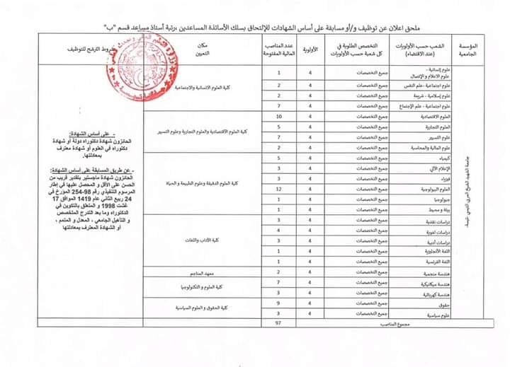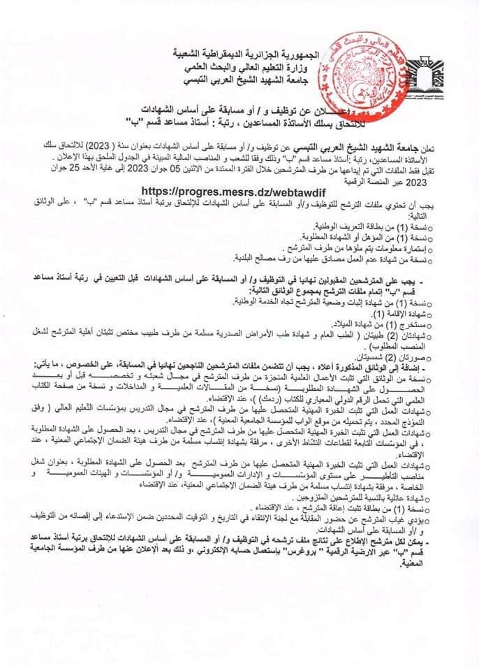 تعلن جامعة العربي تبسي – تبسة عن التوظيف بناء على الشهادة للالتحاق بسلك الأساتذة المساعدين برتبة: