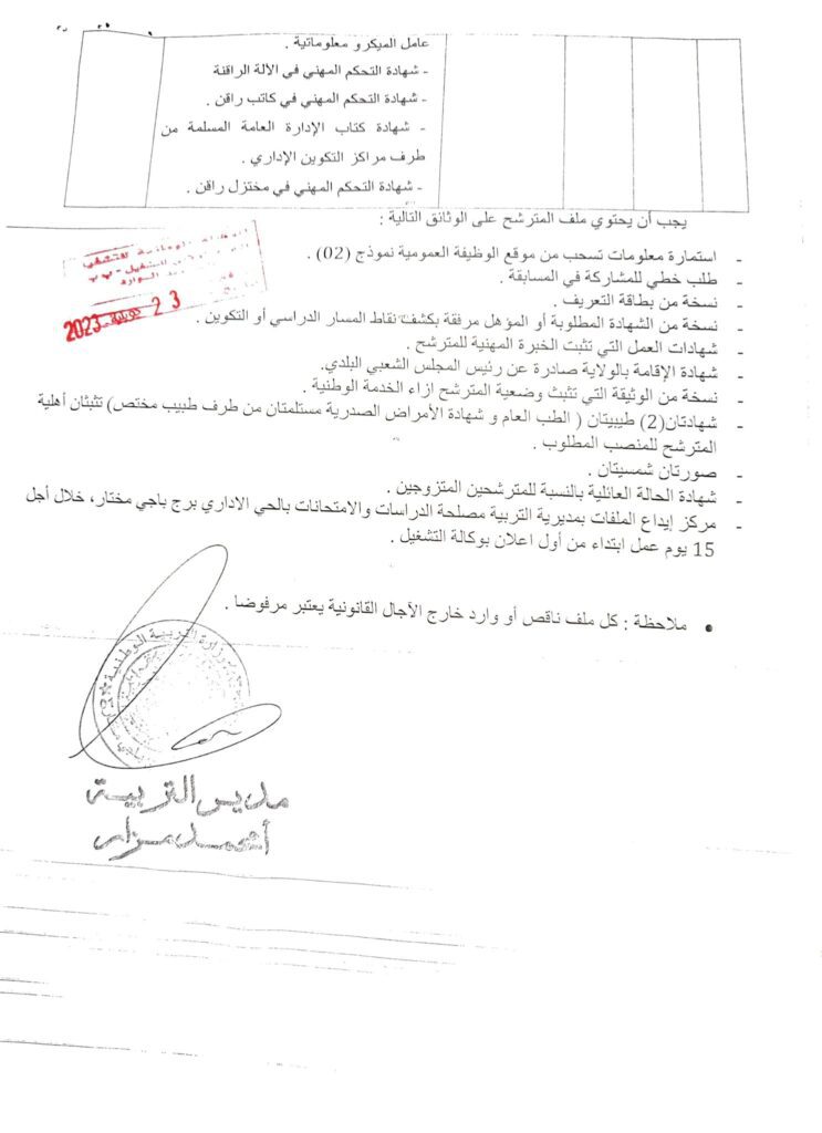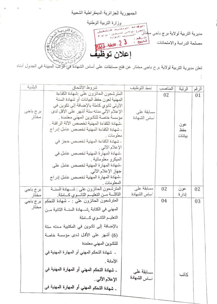 تعلن مديرية التربية والتعليم بولاية برج باجي مختار عن فتح مسابقة للتوظيف بناء على الشهادة في الرتب الموضحة أدناه