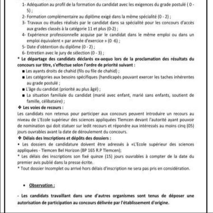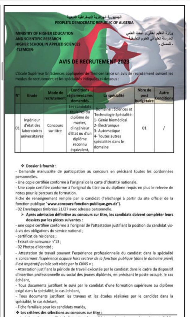تعلن المدرسة العليا للعلوم التطبيقية تلمسان عن افتتاح مسابقة توظيف بناء على الشهادة في الصفوف المبينة أدناه