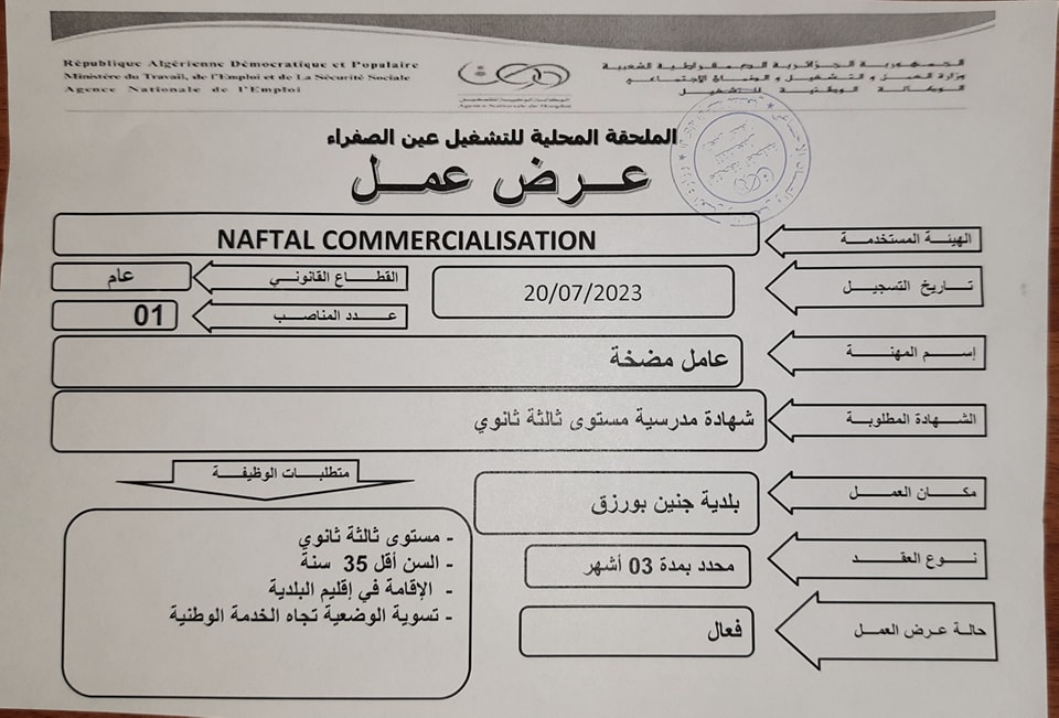 يشرح ملحق محلي للتشغيل عين النعامة الصفراء يتم عرض عرض عمل مع إعلان للتوظيف في شركة Naftal Commercialization أدناه