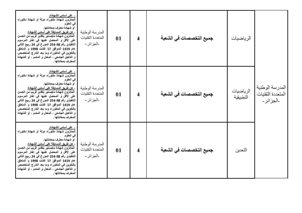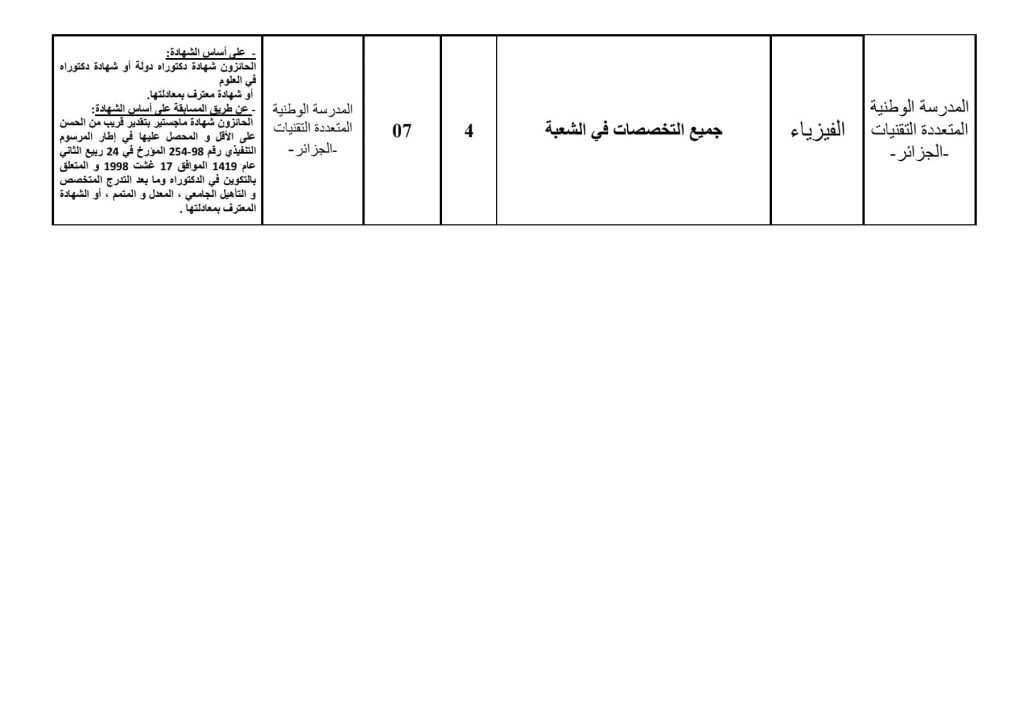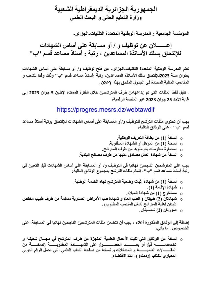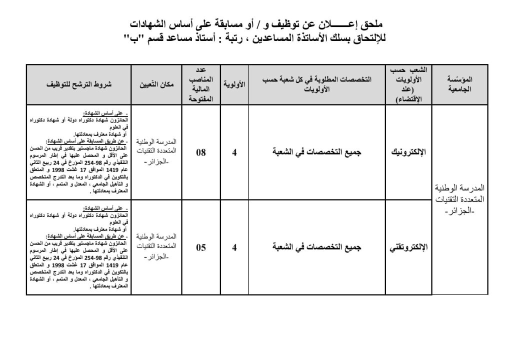 تعلن مدرسة البوليتكنيك الوطنية بالجزائر عن التوظيف بناءً على الشهادة للالتحاق بسلك الأساتذة المساعدين بالرتبة: