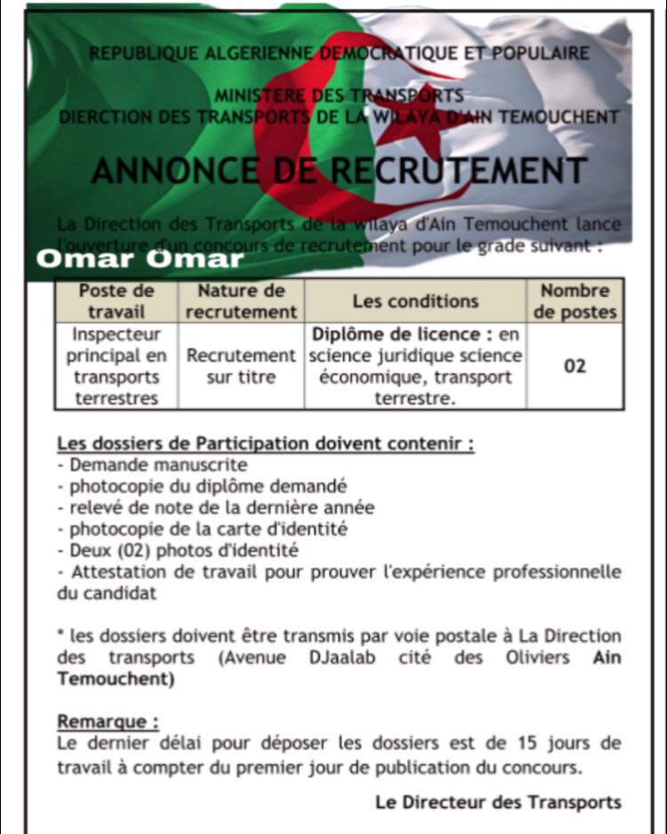 تعلن مديرية النقل بولاية عين تموشنت عن فتح مسابقة توظيف بناء على الشهادة في الصفوف الموضحة أدناه