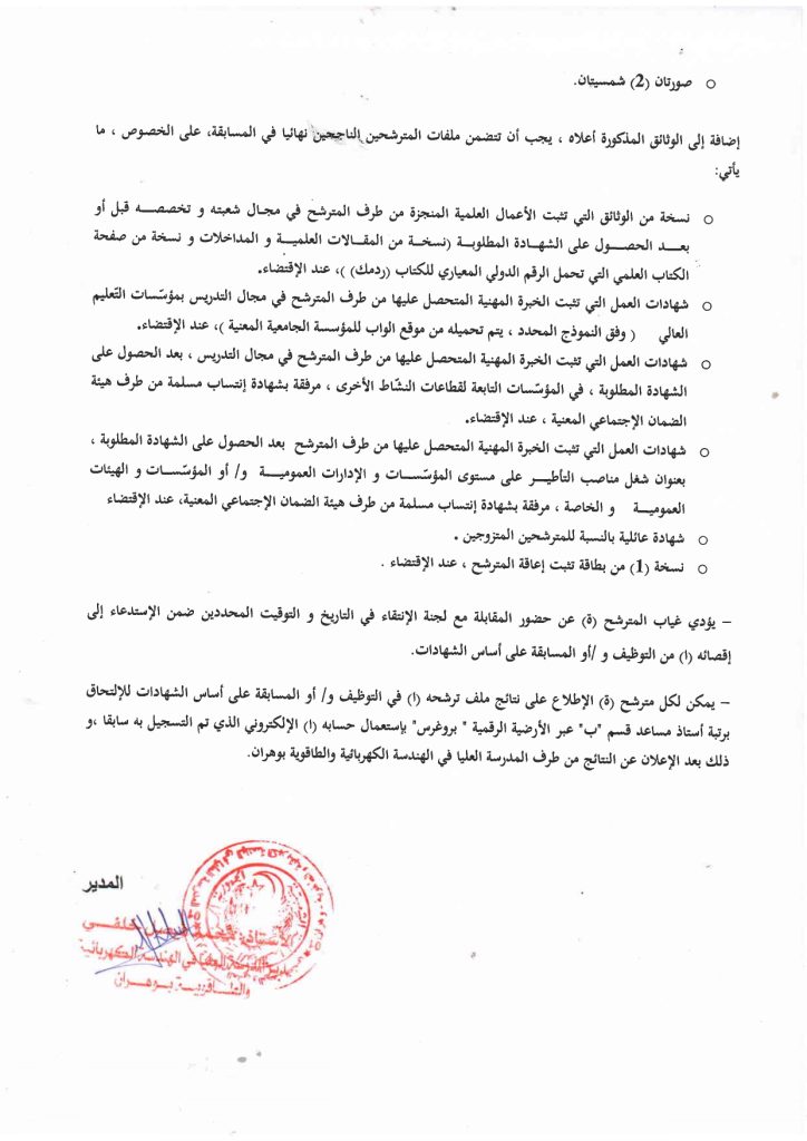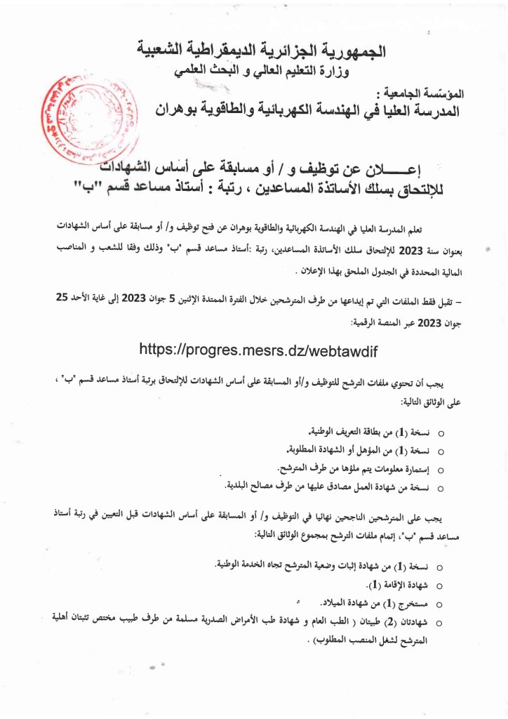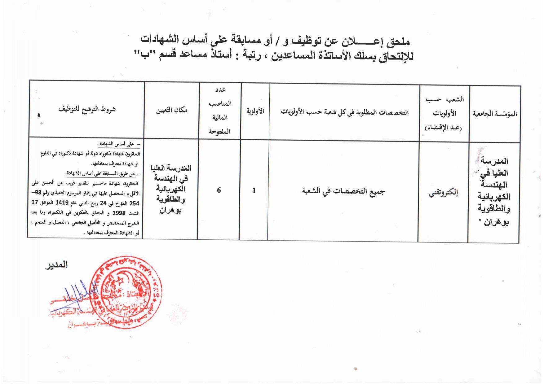 تعلن المدرسة العليا لهندسة الكهرباء والطاقة بوهران عن التعيين على أساس الشهادة للالتحاق بسلك الأساتذة المساعدين برتبة: