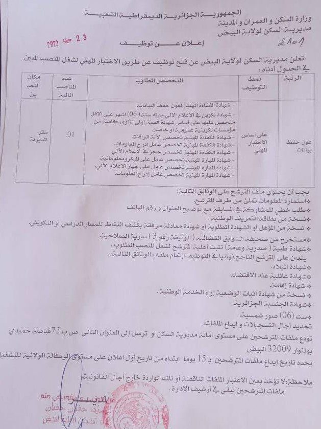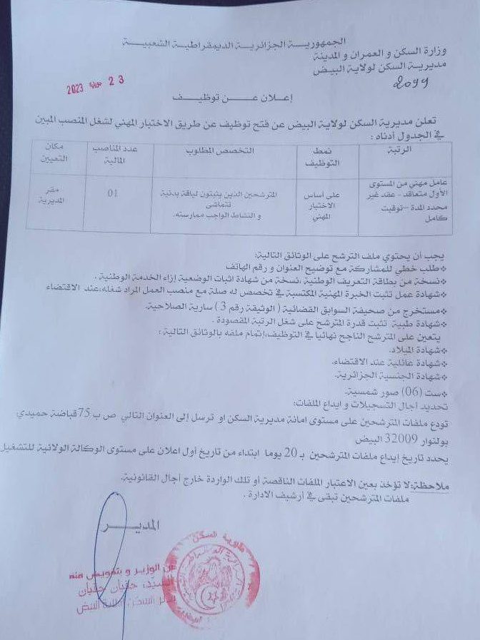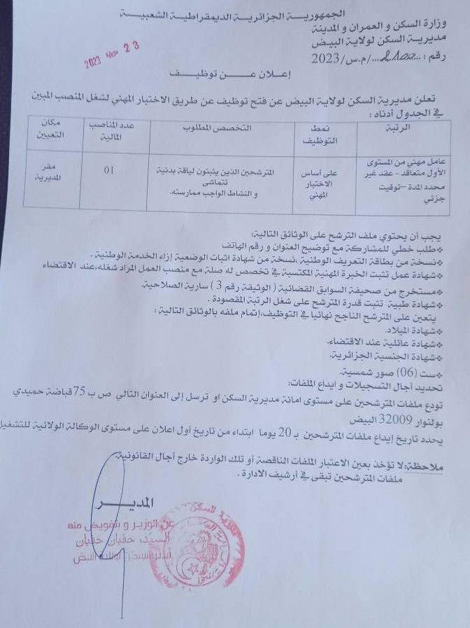 تعلن مديرية الإسكان بولاية البياض عن فتح مسابقة للتوظيف بناء على الاختبار المهني في الرتب الموضحة أدناه