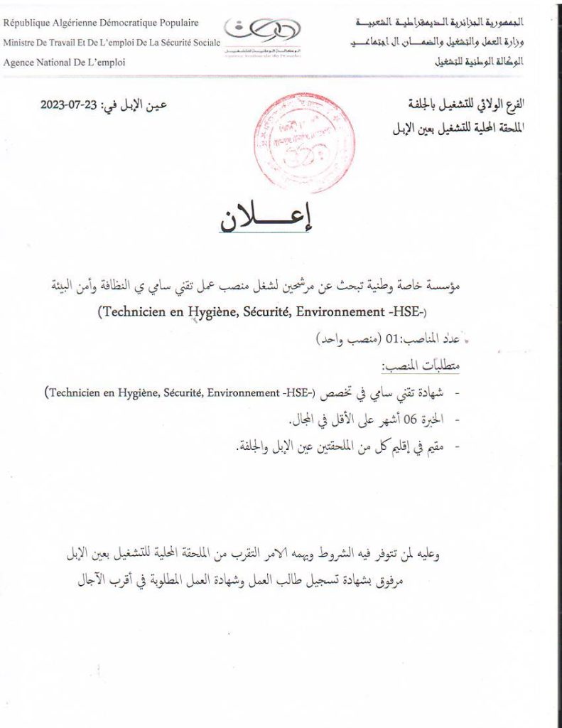 يشرح الارتباط المحلي بعملية عين الأبل بالجلفة نبذة عن عرض عمل لمؤسسة وطنية خاصة بالجلفة كما هو مبين أدناه