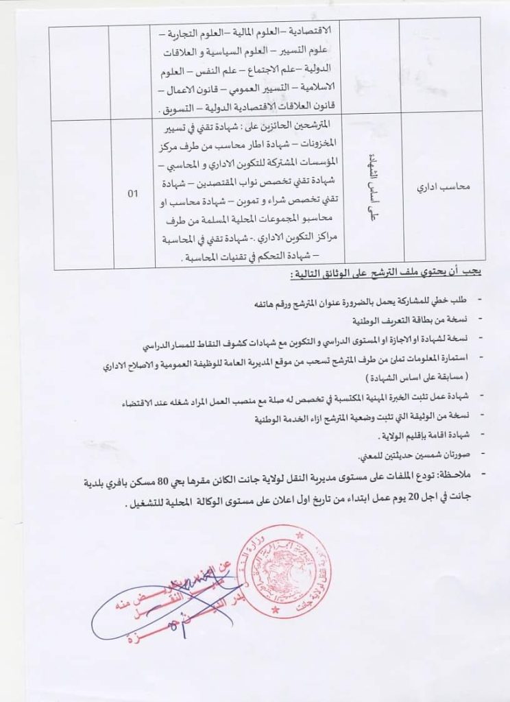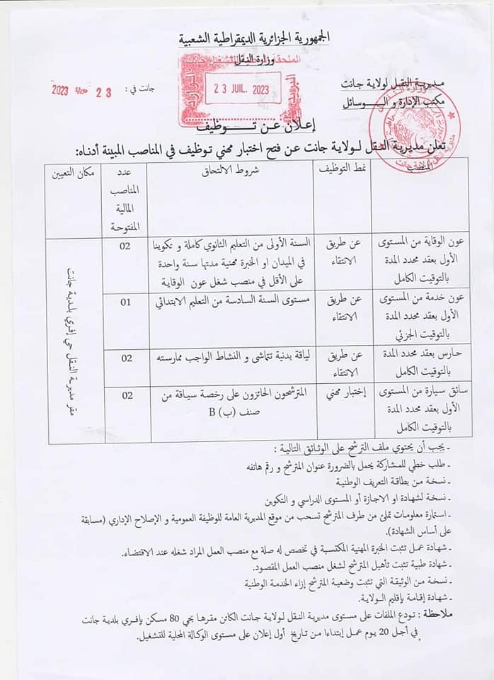 تعلن مديرية النقل بدولة جانت عن فتح منافسة للتوظيف بناء على الشهادة وبالاختيار في الرتب الموضحة أدناه