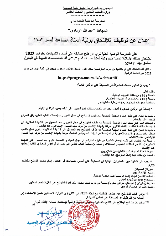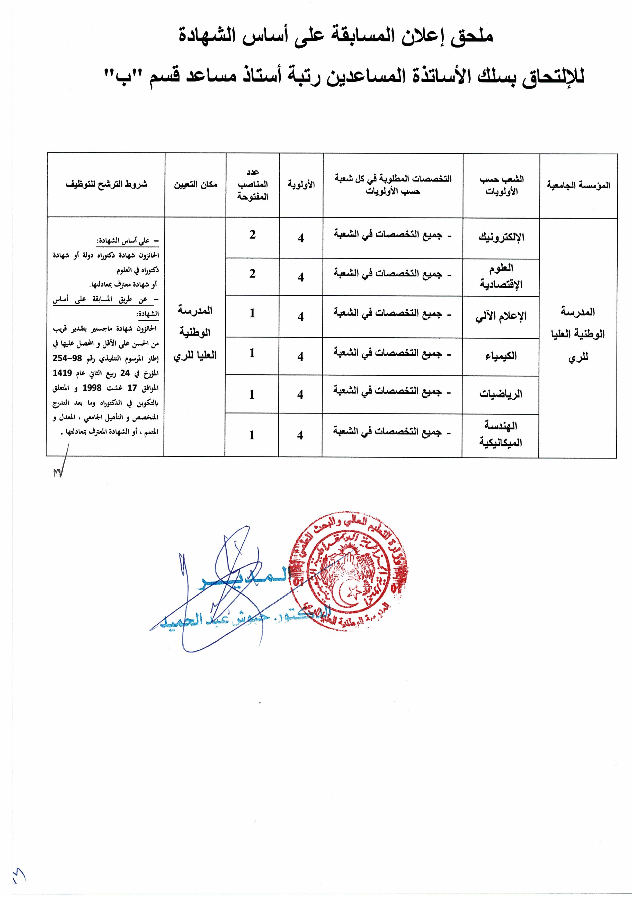 تعلن المدرسة الوطنية العليا للراي عن التوظيف بناءً على شهادة الالتحاق بسلك الأساتذة المساعدين برتبة: