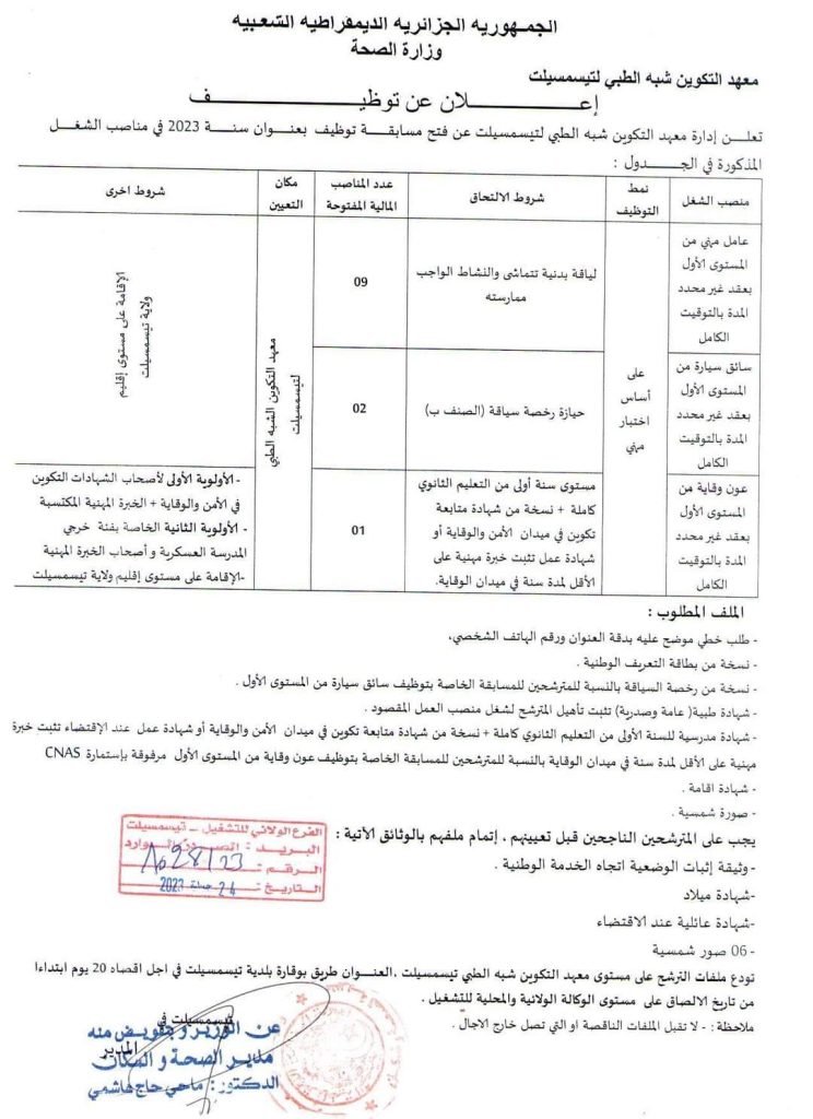 يعلن معهد تدريب المساعدين الطبيين بولاية تسمسيلت عن افتتاح مسابقة توظيف بناءً على الشهادة في الرتب الموضحة أدناه