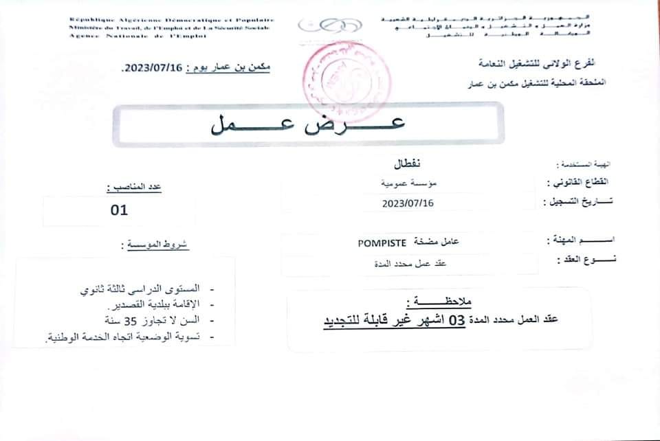 يشرح ملحق محلي للتشغيل كمين بن عمار ومرفقة بني عباس عروض العمل بشركة نافتال تم وصفه أدناه