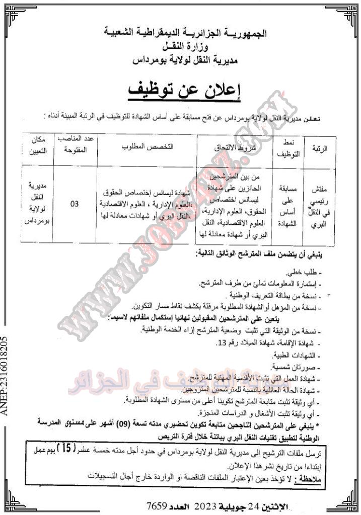تعلن مديرية نقل ولاية بومرداس عن فتح مسابقة توظيف بناء على الشهادة في الصفوف الموضحة أدناه