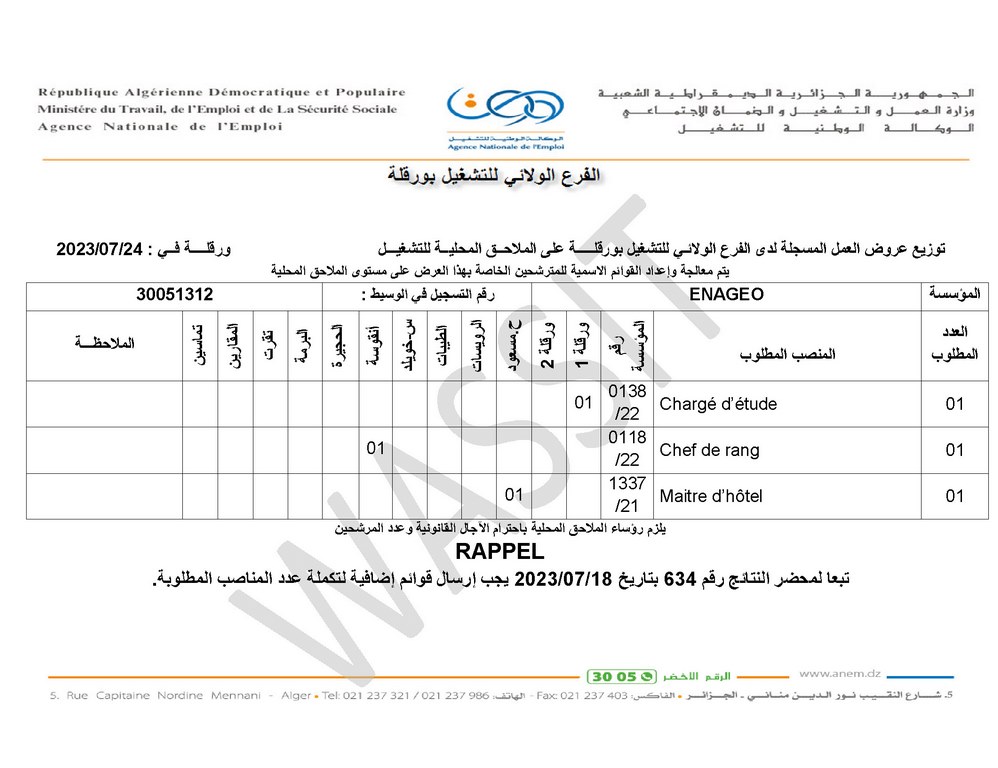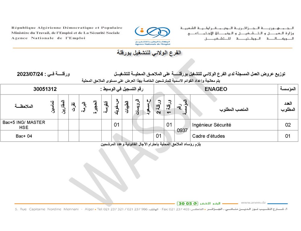 أعلن دائرة عمليات ولاية ورقلة حول عرض عمل في National Geophysical Institute ENAGEO كما هو موضح أدناه
