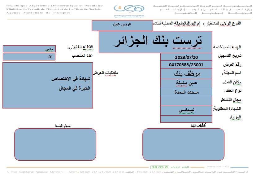 يشرح ملحق محلي للتشغيل عين مليلة أم البواقي عرض العمل بائتمان بنك الجزائرz موضح أدناه